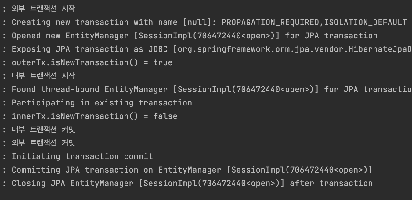 - 외부 트랜잭션을 시작할 때는 Creating new transaction이라는 로그가 찍혔고, 외부 트랜잭션을 커밋할 때는 Initiating transaction commit이라는 로그가 찍혔다.