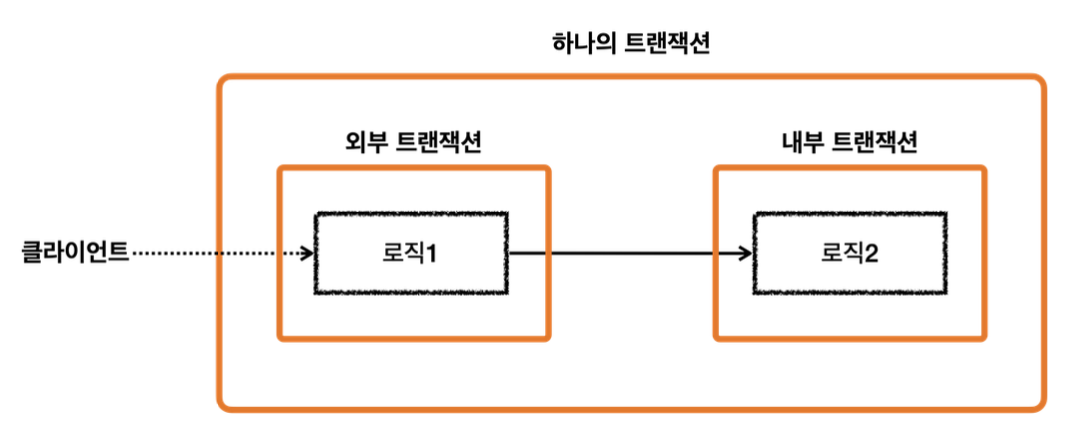 트랜잭션이 수행중이고 아직 끝나지 않았는데 또 다른 트랜잭션이 수행되면 어떻게 될까? 이때 처음 시작된 트랜잭션을 상대적으로 밖에 있기 때문에 외부 트랜잭션이라고 하고, 이후에 시작된 트랜잭션을 외부 트랜잭션 수행 도중에 호출되기 때문에 내부에 있는 것처럼 보여서 내부 트랜잭션이라고 한다. (스프링은 트랜잭션 전파 옵션에 따라 다르게 동작하는데, REQUIRED를 기준으로 설명하겠다.)