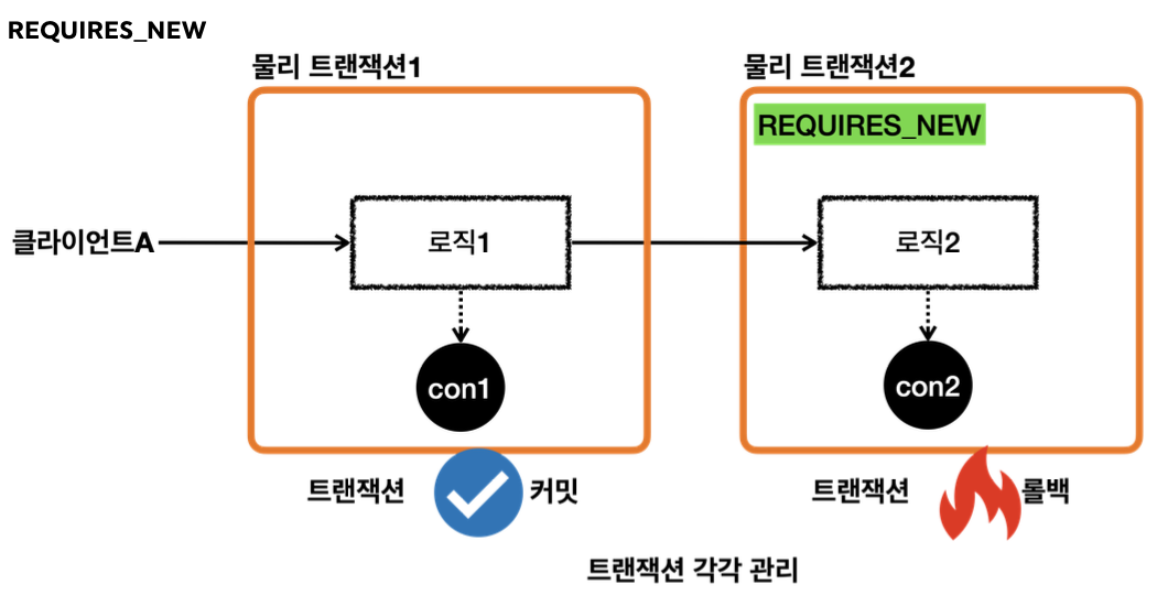 따라서 이런 경우를 방지하려면 외부 트랜잭션과 내부 트랜잭션을 별도로 분리해서 각각의 물리 트랜잭션을 사용하면 된다. 이렇게 외부 트랜잭션과 내부 트랜잭션을 분리하려면, 내부 트랜잭션을 시작할 때 REQUIRES_NEW 옵션을 사용하면 된다. 그러면 내부 트랜잭션은 별도의 물리 트랜잭션을 가진다. 즉 별도의 DB 커넥션을 사용한다. 따라서 각 트랜잭션은 커밋/롤백이 각 커넥션을 통해 개별적으로 이뤄지며 서로에게 영향을 주지 않는다.
