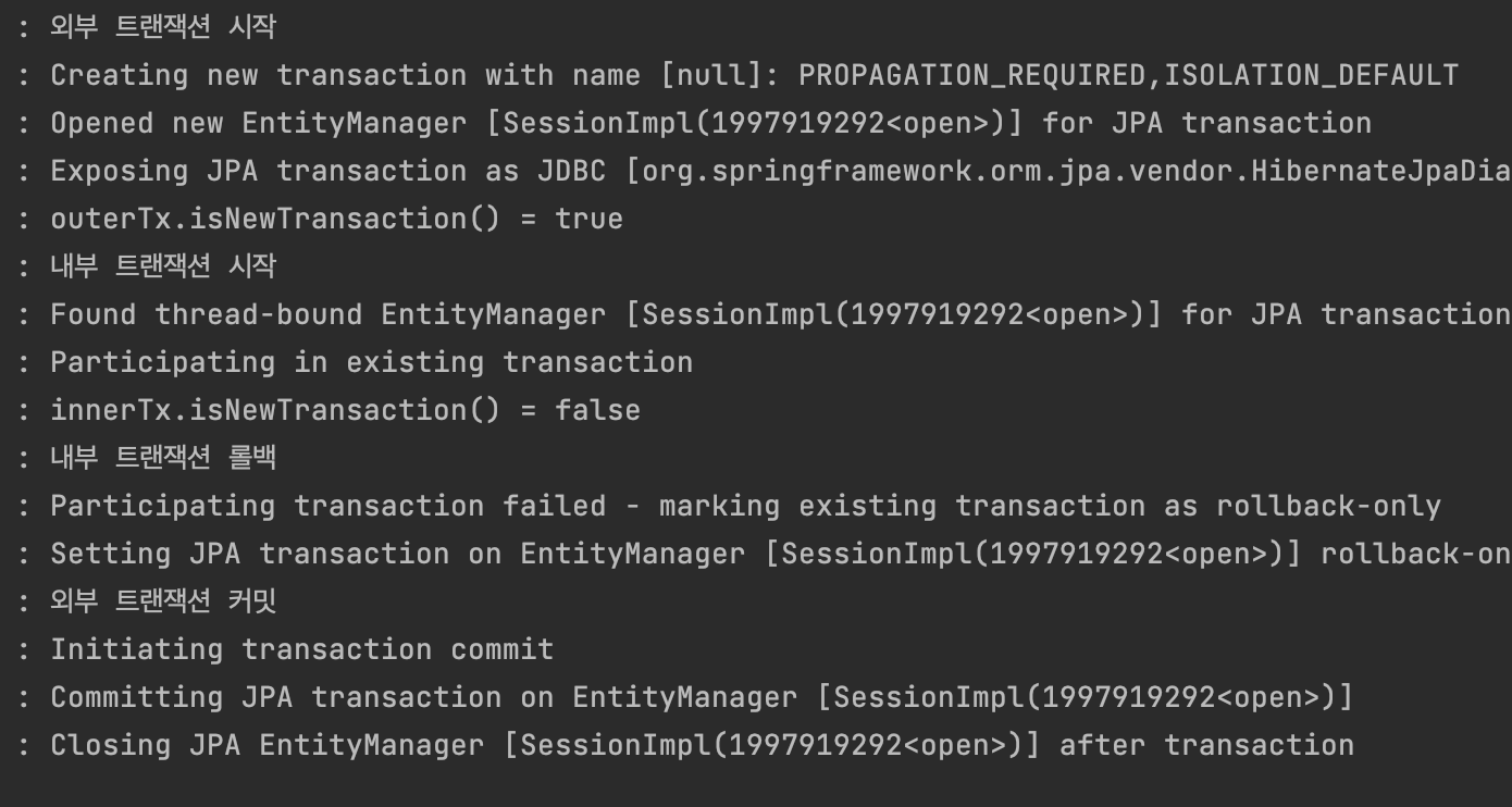 - 트랜잭션 매니저는 롤백 시점에 신규 트랜잭션 여부에 따라 다르게 동작한다. 이 경우 신규 트랜잭션이 아니기 때문에 실제 롤백을 호출하지 않는다.