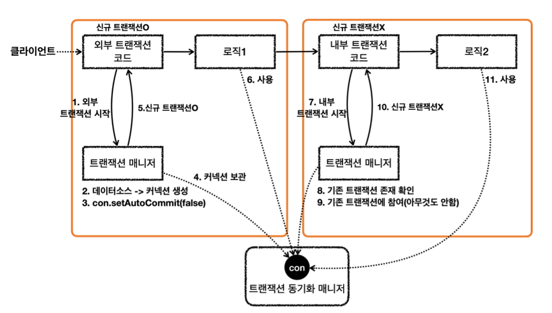 - [내부 트랜잭션] txManager.getTransaction()을 통해 내부 트랜잭션을 시작한다.