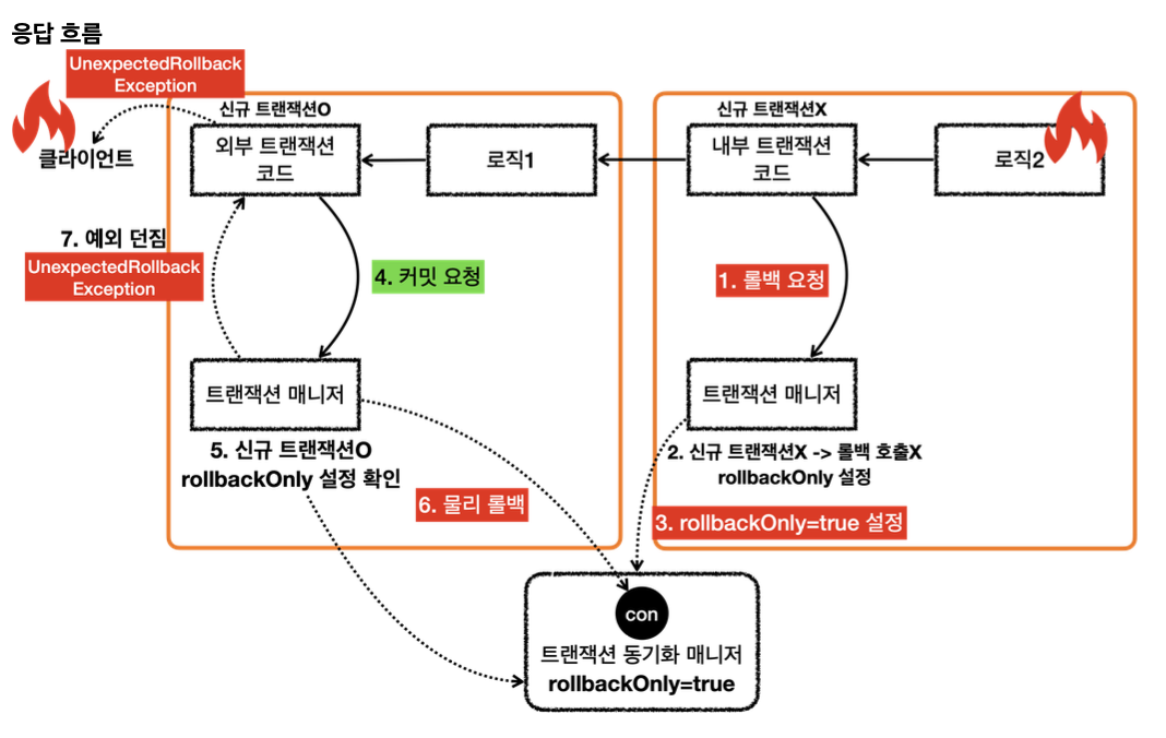 - 그리고 외부 트랜잭션을 커밋하면 물리 트랜잭션이 롤백 전용으로 표시되어 있기 때문에 물리 트랜잭션을 롤백한다.