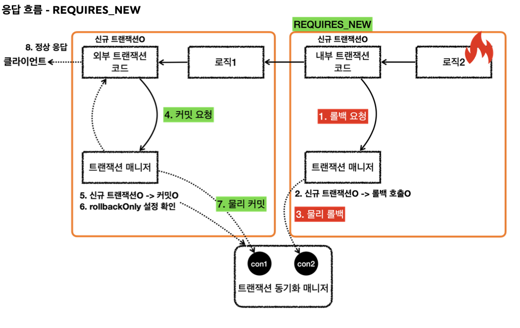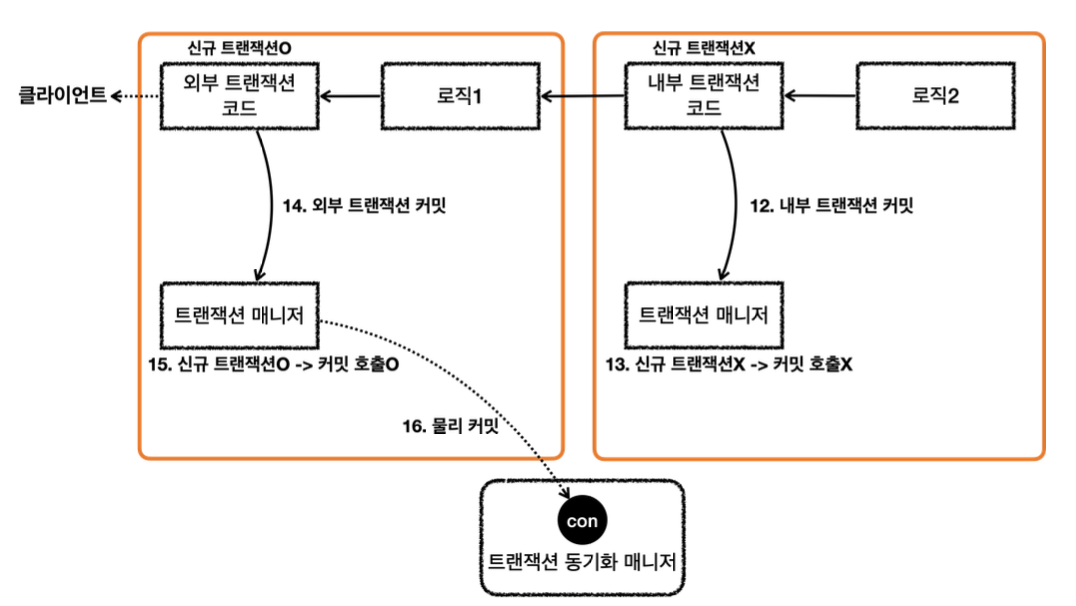 - [외부 트랜잭션] 로직 1이 끝나고 트랜잭션 매니저를 통해 내부 트랜잭션을 커밋한다.